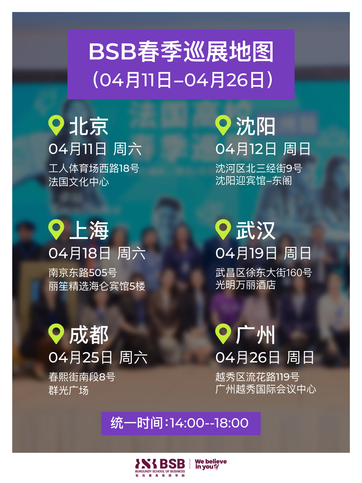 4月11日-26日,勃艮第高商将重磅亮相2026年法国高校春季巡展!我们的招生官将依次前往北京、沈阳、上海、武汉、成都及广州6大城市。我们的招生官将面对面帮你解决所有申请疑难杂症、专业选择指导与职业发展咨询。