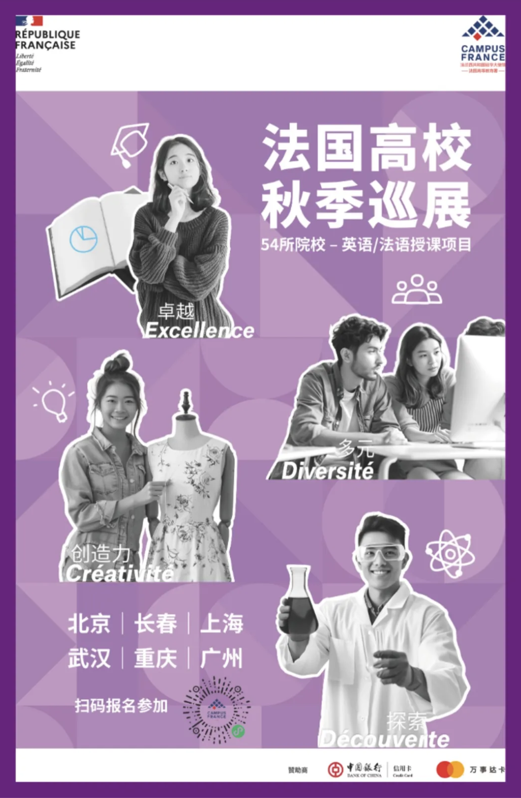 今年的法国高校秋季巡展已经开启报名,共有54所法国院校参与,覆盖各个专业领域,以满足学生和家长的不同期待。巡展将于11月8日至23日走到北京、长春、上海、武汉、重庆、广州六大城市,带来与法国高校代表面对面交流的宝贵机会。